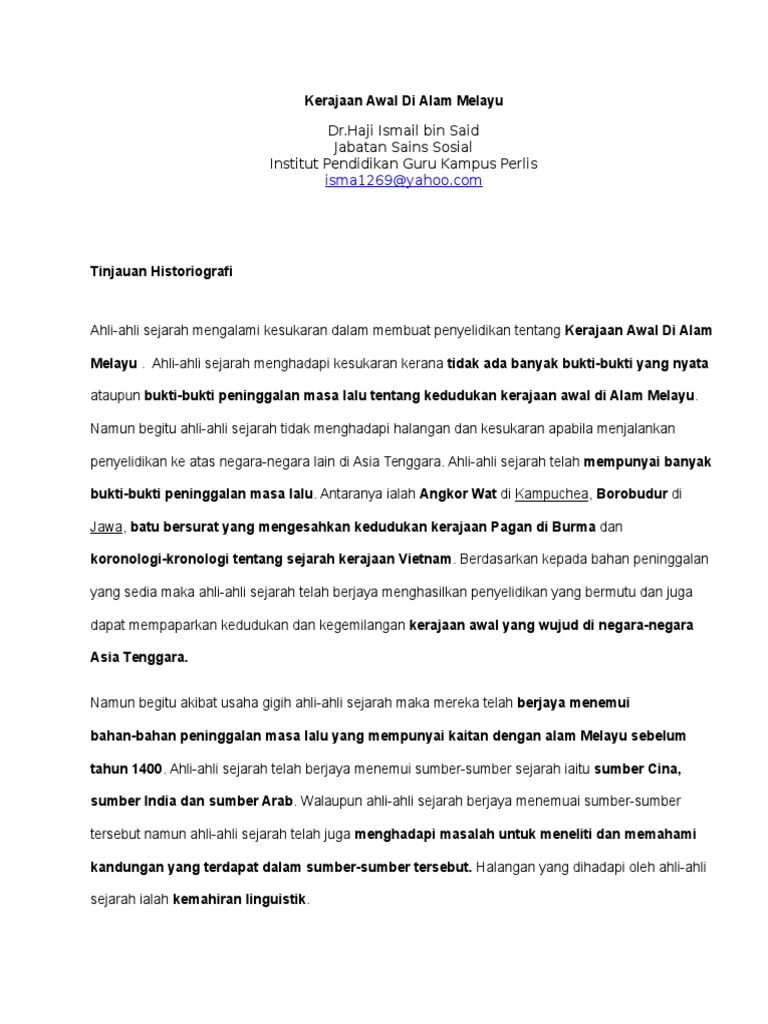 Konon, aki tirem yang merupakan tokoh awalnya berletak di daerah teluk lada pandeglang seperti yang disebut oleh ptolemeus tahun 150. Di kawasan kepulauan melayu dapat dilihat melalui kedah tua, gangga negara dan langkasuka, srivijaya, majapahit. 4.1.# mengenal pa$ti l%ka$i kerajaankerajaanmelayu pada peta malay$ia. · kemunculan tamadun awal asia tenggara dapat dibuktikan dengan wujudnya kerajaan awal di tanah besar spt:funan, chenla, angkor, sukhotai, dan ayuthia. Kewujudan kerajaan alam melayu sejak awal abad pertama membuktikan bahawa alam melayu juga mempunyai kerajaan yang.